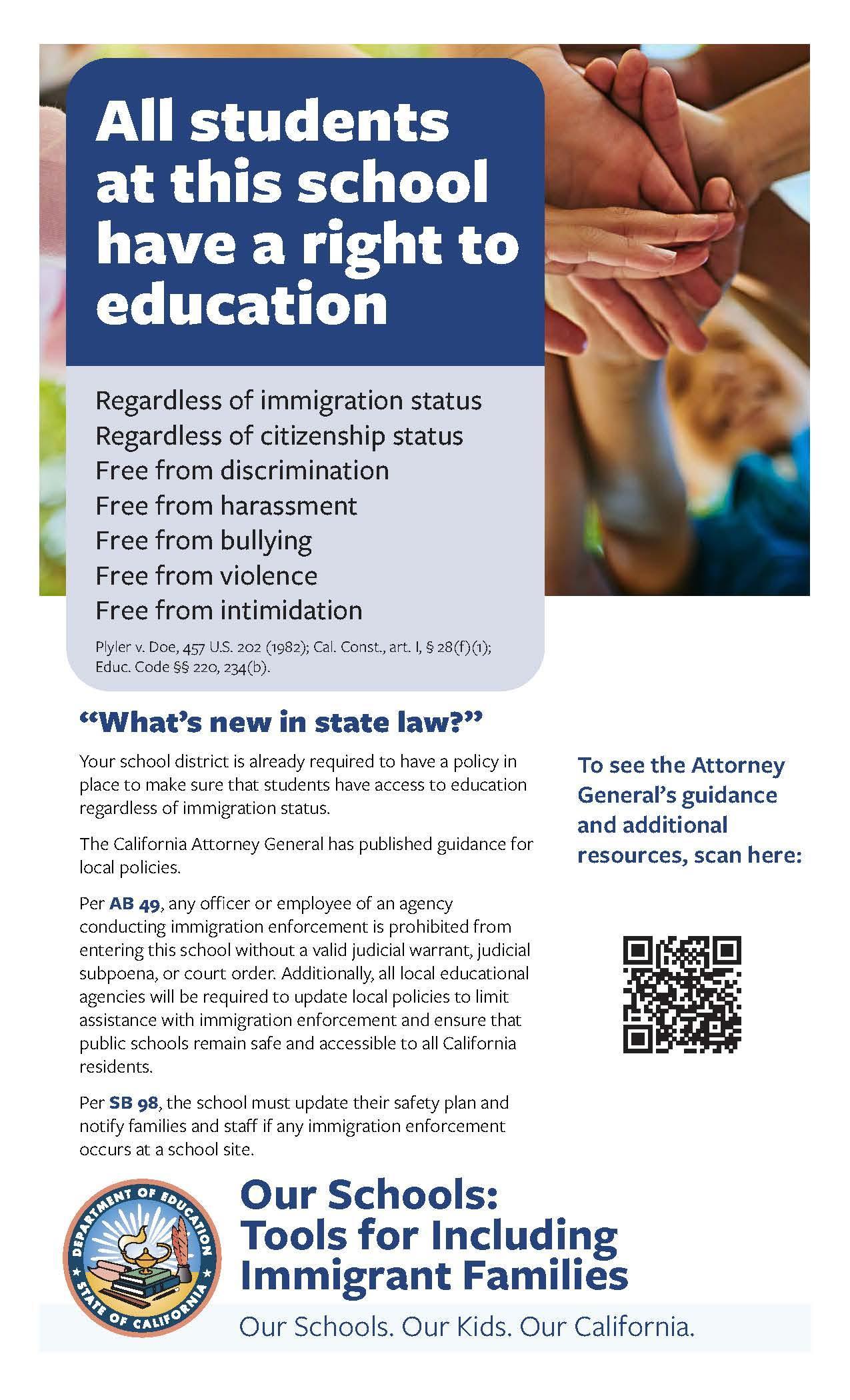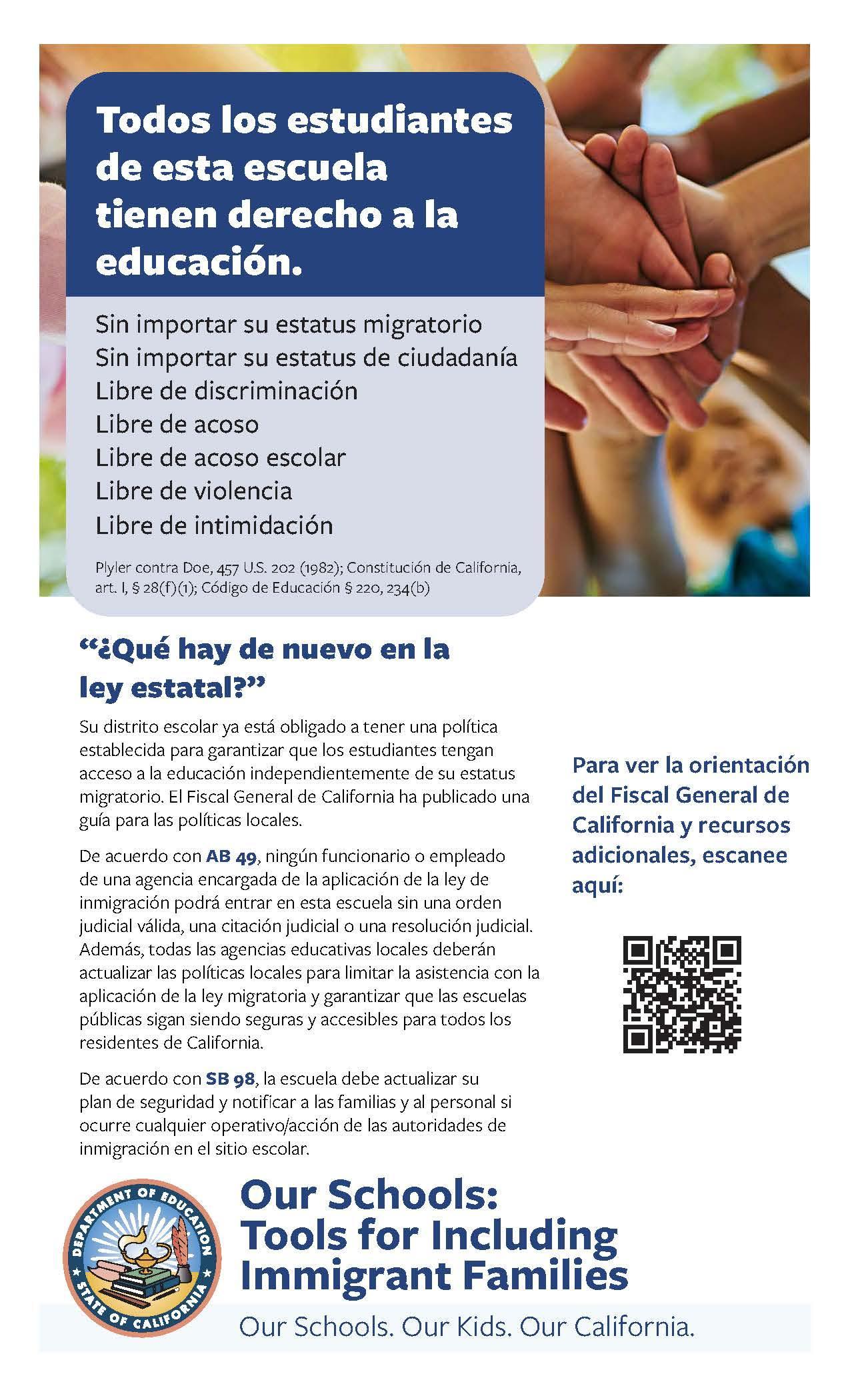 - Ley SAFE (SB 98): Requiere que las autoridades notifiquen a las escuelas cuando haya actividades de aplicación de inmigración dentro o cerca de los planteles escolares.